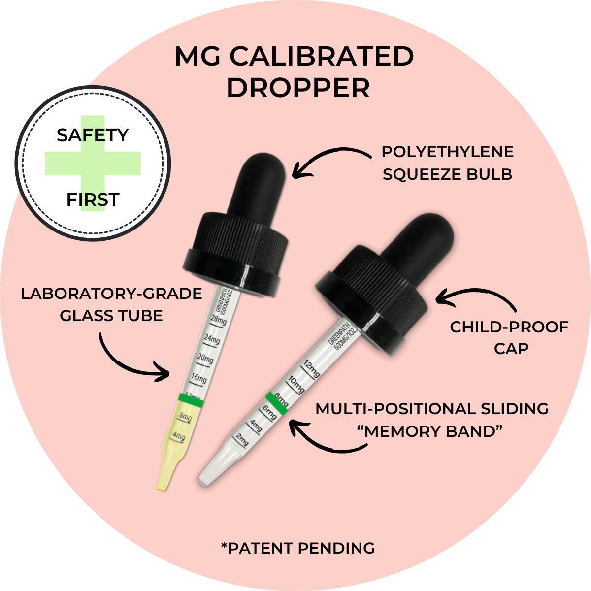 FIRST, I developed a exclusive MG dropper with a sliding band, so I didn’t have to remember my settings. Next, I found CBD that was non-intoxicating and tested pure. I also added a log to track my results.